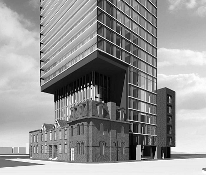 With GBCA Architects leading the project’s heritage component, the front of three existing, three-storey brick buildings (dating from the 1860s—combining Victorian gables with Georgian massing)—will be preserved and merged into the base of the development.