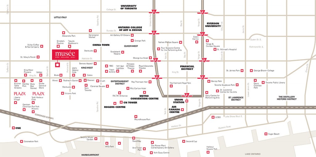 Everywhere you turn at Musée, there is an opportunity to discover and explore. Work, school, shopping and lifestyle amenities are all easily accessible by day. Nearby Queen Street West is a virtual fashion runway with one trend-setting store after the next.Musee Condo's Area Map